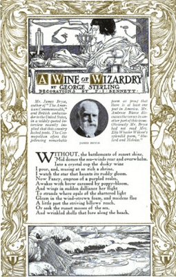 Cosmopolitan published Sterling’s poem “A Wine of Wizardry” in 1907, and Bierce proclaimed him the heir to Keats, Coleridge, and Rossetti. Many others begged to differ. There was apparently a low bar for controversy in 1907, because this one was huge. Meanwhile, things were getting pretty wild in Carmel. There were, or so rumor had it, nude beach parties, free love (gay and straight), wife-swapping, and opium dens.