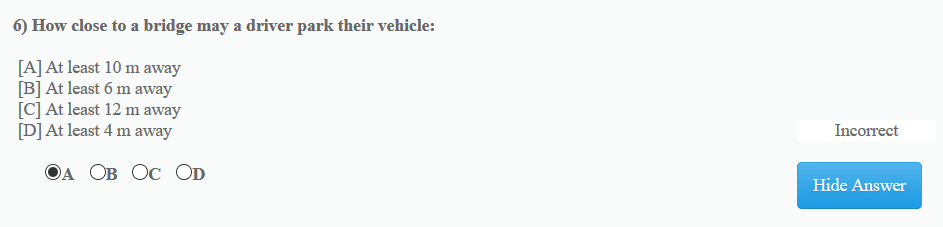 Question from South African practice driver's test, how far from a bridge must you park.