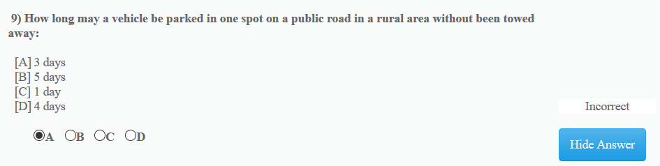 Question on practice South African driver's license test, for how long can you park a car on a rural road?
