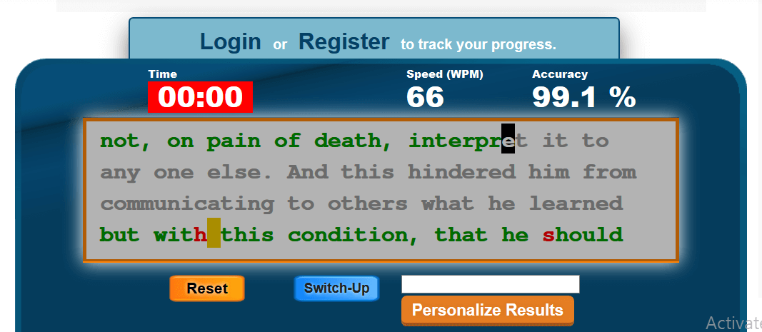 Screenshot of online typing test, 66 wpm, 99 percent accuracy.