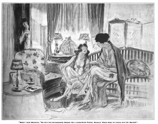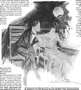 Of course she’s not really going to have her hair bobbed. Short hair on women is considered immoral in respectable circles in 1920 (or 1919, if you allow for publication lead times). It’s just a line. But it works! The new Bernice and her inane babble are the toast of the town. As the weeks go by, she compiles an impressive list of admirers. Including—uh oh!—Warren. Remember him? Marjorie’s admirer who got stuck with Bernice on the veranda? Marjorie, who is not as indifferent to Warren as she lets on, is NOT amused.