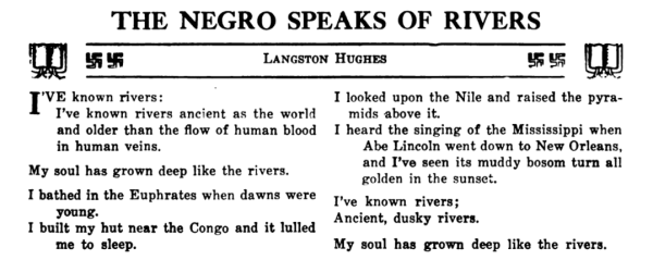 The poem was “The Negro Speaks of Rivers.” It appeared in the June 1921 issue of The Crisis and became Hughes’ signature poem.******