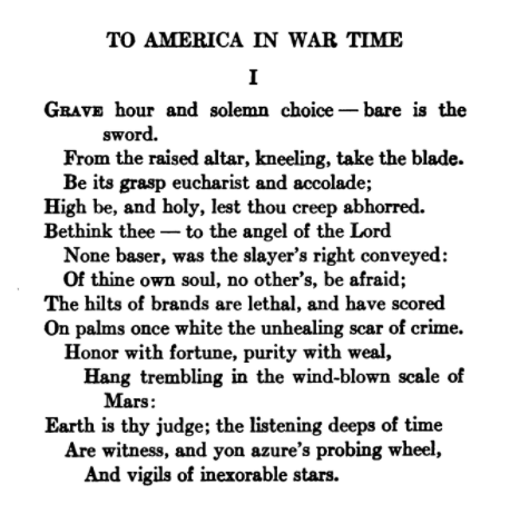 ********His poetry, not so much. Here are the opening lines of a typical example, which was published in an anthology of war poems after appearing in The Nation.