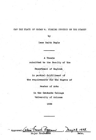 And then I found it, the Rosetta Stone of Oscar Firkins studies: a 1938 University of Arizona master’s thesis by Lena Smith Doyle titled “Can the Plays of Oscar W. Firkins Succeed on the Stage?” Her answer, in brief, is “sort of,”******* but, more to the point for my purposes, the thesis includes a ten-page chapter on Firkins’ life.