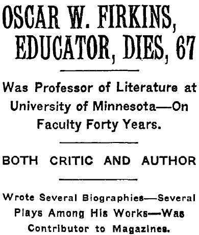 Finally, in an entry on Firkins in the SNAC Archive,****** I learned that he was a professor at the University of Minnesota and a well-known critic, and that he also wrote plays and poetry. He was born in 1864 and died in 1932.