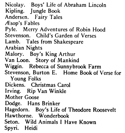 Fellow children’s book columnist Marian Cutter weighs in in the December Bookman, but mostly about classics.* She and others, like Library Journal and The World’s Work,** are abuzz about a list of the best books for children that a group of librarians and educators had come up with. The idea is that, if you have a one-room schoolhouse and a limited budget, these are the books you should buy. Other than the boy-specific titles and some colonialism, the list holds up pretty well today. Little Women is the runaway winner, followed by the two Alice books, Robinson Crusoe, Tom Sawyer, and Treasure Island, followed by: