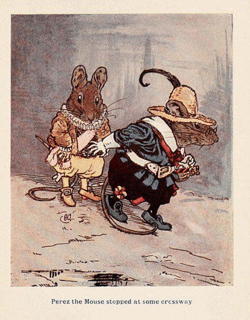 Luis Coloma, a Spanish priest and Royal Academy member, was commissioned to write Perez, the Mouse (originally Ratón Pérez) in 1894 for eight-year-old King Alfonzo XIII, who had lost a tooth. Perez lives in a box of cookies with his family and runs through the city’s pipes to the rooms of children who have lost their teeth. To this day, children in Spanish-speaking countries to this day leave their teeth under their pillows for the mouse. This 1914 version, reprinted in 1922, was adapted by Lady Moreton with illustrations by George Howard Vyse. “A great favorite with children,” Moore calls it, and I can see the appeal.