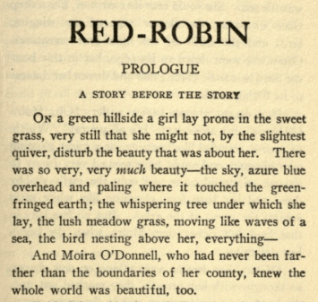 “Books written for girls present the usual problem,” Moore says, but doesn’t explain what the problem is. This is my fourth year on the beat, so I think I know what she means: they’re boring. I had high hopes for Red-Robin by Jane Abbott, though, since it had gotten rave reviews. I was sorely disappointed. If you think I’m just being grumpy, here’s the opening: