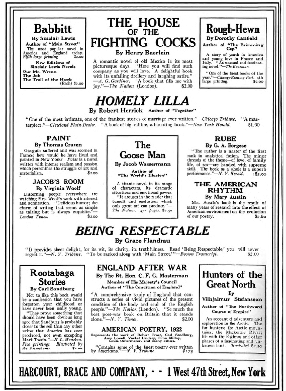 The New York Times included Jacob’s Room in a March 4, 1923, fiction roundup. The anonymous reviewer writes that, though the book is composed of mostly minor events, “it is the manner in which these things are revealed that makes the book of importance, at least as an example of what the younger rebels are doing in England.” The review says of the book’s style that “at first one is uneasily aware of Miss Woolf’s bizarre qualities as a writer of prose, but after one has progressed a way in the book this consciousness rather vanishes.” It wraps up by placing Woolf among a cohort of talented British women writers, none of whom, aside from May Sinclair, I have ever heard of,****** saying, “Her influence is one that modern England needs.”
