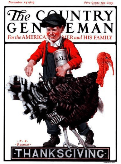 Speaking of the New Year’s babies, this J.F. Kernan Country Gentleman cover recalls Leyendecker’s 1922 cover, also featuring a bird’s tail being salted.