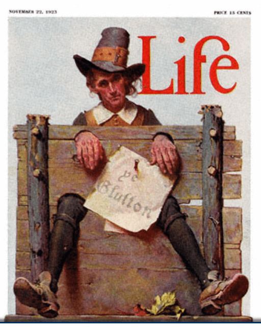 With Leyendecker doing the honors at the Saturday Evening Post, Norman Rockwell was over at Life depicting a svelte Pilgrim in the stocks for gluttony.