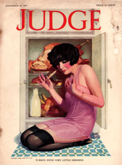 Rival humor magazine Life took a more risqué approach to the holiday with an Enoch Bolles cover titled “Turkey with Very Little Dressing.”*