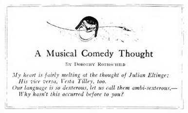 On the musical Going Up, April 1918: It’s one of those exuberant things—the chorus constantly bursts on, singing violently and dashing through maneuvers, and everybody rushes about a great deal, and slaps people on the back, and bets people thousands of stage dollars, and grasps people fervently by the hand, loudly shouting, “It’s a go!”
