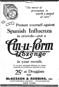 Authorities keep saying that the worst of the Spanish influenza epidemic is over, but they keep being wrong. This is a hard story to follow if you’re not reading historical accounts, but my fellow 100-years-ago blogger Whatever It Is, I’m Against It is on the job. He’s been tracking the coverage of the epidemic in the New York Times from the beginning, as well as highlighting the ridiculous ads touting the purported flu-preventing qualities of various products, like this one, which I saw in the Times and was going to use myself so it isn’t copying: