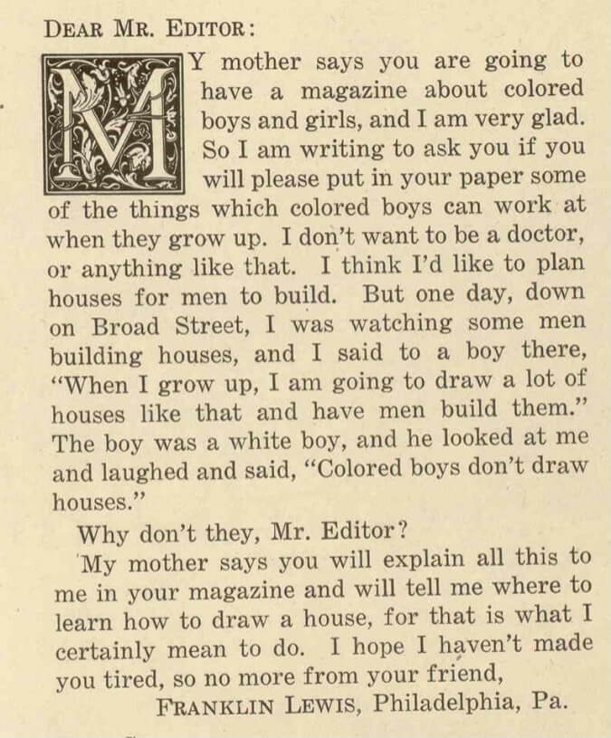 “The Jury,” a page of letters from young readers, is the part of The Brownies’ Book I enjoyed the most. In the January 1920 inaugural issue, a boy named Franklin Lewis, who dreams of being an architect but isn’t sure if this is possible, writes in asking “if you will please put in your paper some of the things which colored boys can work at when they grow up.”**