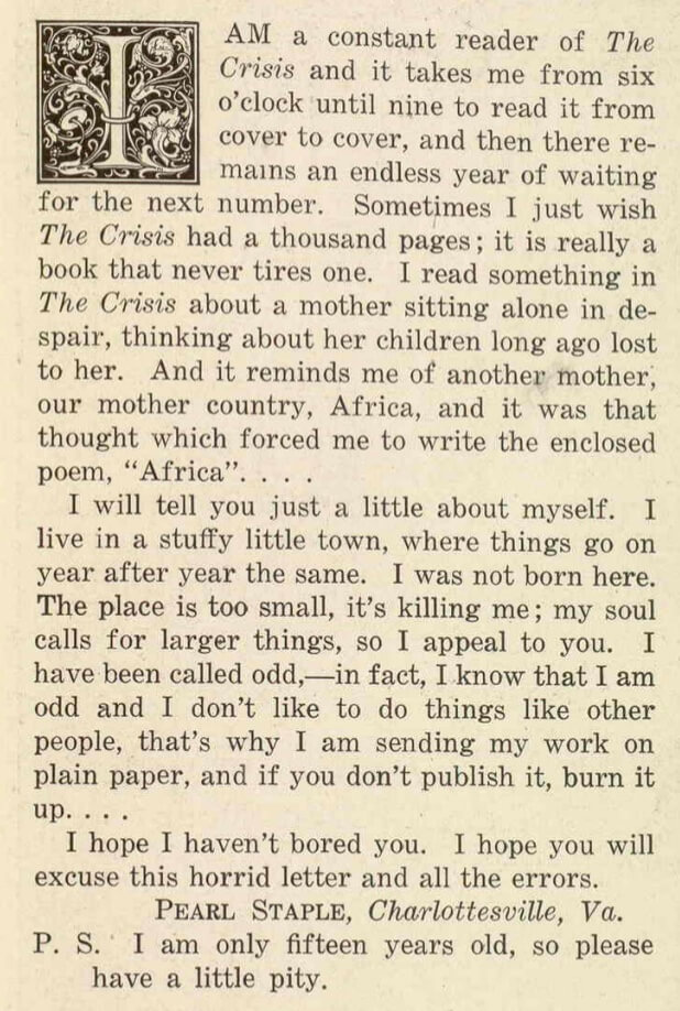 This cri de coeur by a reader, addressed to The Crisis but printed in “The Jury,” is both sad and hilarious. “P.S. I’m only fifteen years old, so please have a little pity,” she concludes.