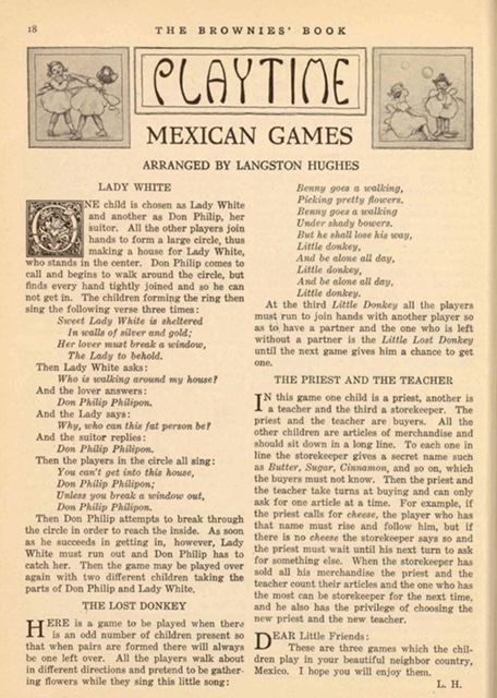 Here he is with a byline, describing games children play in Mexico, where he had gone to live with his father after his graduation. (UPDATE 5/1/2021: After reading this post, Frank Hudson of The Parlando Project put the words of a Langston Hughes poem from The Brownies’ book to music.)